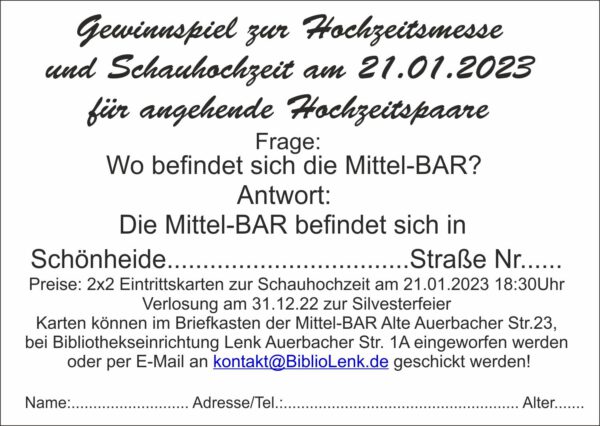Gewinnt 2×2 Karten für die Schauhochzeit am 21.01.2023, in dem ihr die Gewinnspielfrage beantwortet und uns bis Silvester per eMail an kontakt@bibliolenk.de oder per Einwurf in unseren Briefkasten des ausgefüllten…