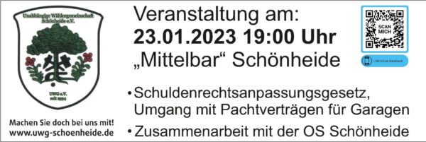 Veranstaltung am 23.01.2023 19:00 Uhr „Mittelbar“ Schönheide Bürgergespräch (der UWG) mit den Themen: – Schuldrechtsanpassungsgesetz – Umgang mit Pachtverträgen für Garagen – Zusammenarbeit mit der OS Schönheide