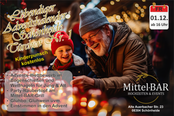 🌟🎄 Startet mit uns in die magische Adventszeit in Schönheide! Am 1. Dez. öffnen wir ab 16 Uhr das erste Türchen des 1. „Lebendigen Adventskalenders“ in Schönheide mit 🎯 Advents-Wettbewerb…